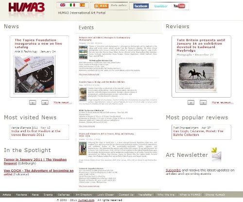 HUMA3 International Art Portal is a multilingual portal that offers in a digital magazine format the most complete information about the Art World, in the language of your choice (English, Spanish or Italian). The digital magazine collaborates with more than 1500 Museums, Cultural Centres and Exhibition Halls all around the world, bringing news on more than 5000 exhibitions in more than 500 main cities.